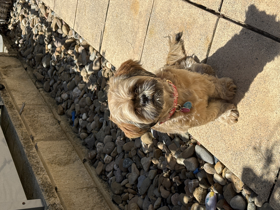A small, furry dog with tan and brown coloring sits on a patio. The dog wears a patterned collar with tags. One side of the patio is paved with square tiles, while the other side is covered in small, rounded pebbles. A shallow trough runs along the edge. The dog appears to be resting in the sunlight, casting a shadow on the tile.