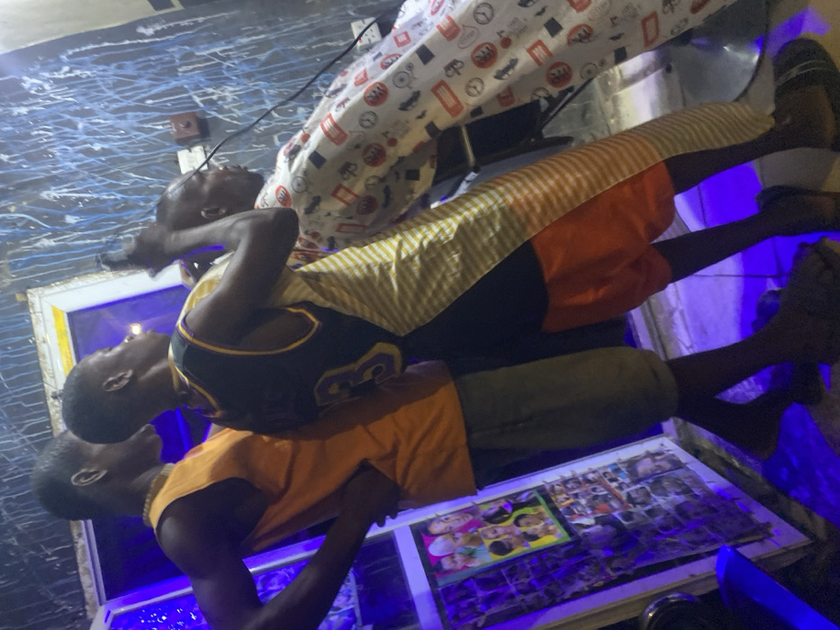 The image depicts an interior scene within a barbershop in Onitsha, Nigeria