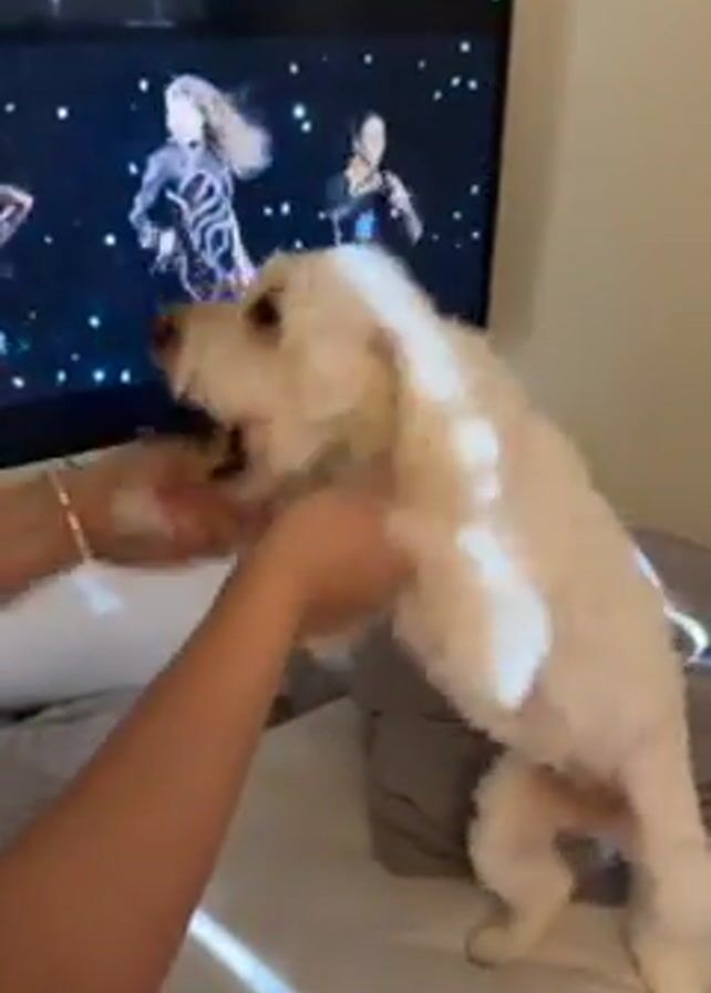 A person is holding the front paws of a small, light-colored dog, causing the dog to stand on its hind legs. The person is wearing a bracelet on their left wrist. The dog is standing on a bed with a gray pillow. In the background, a television is playing a video of a musical performance with a woman singing on a stage with bright lights. The room appears to be a bedroom with neutral-colored walls. The interaction between the person and the dog suggests playfulness.