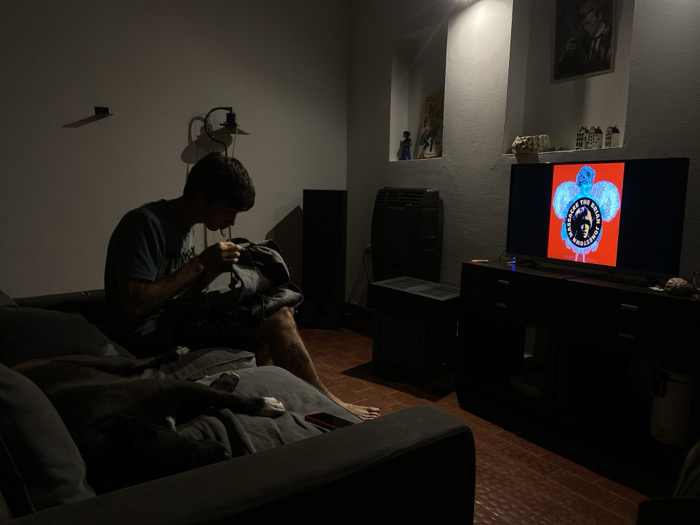 A dimly lit living room shows a man mending clothes on a grey couch, with a dog resting beside him