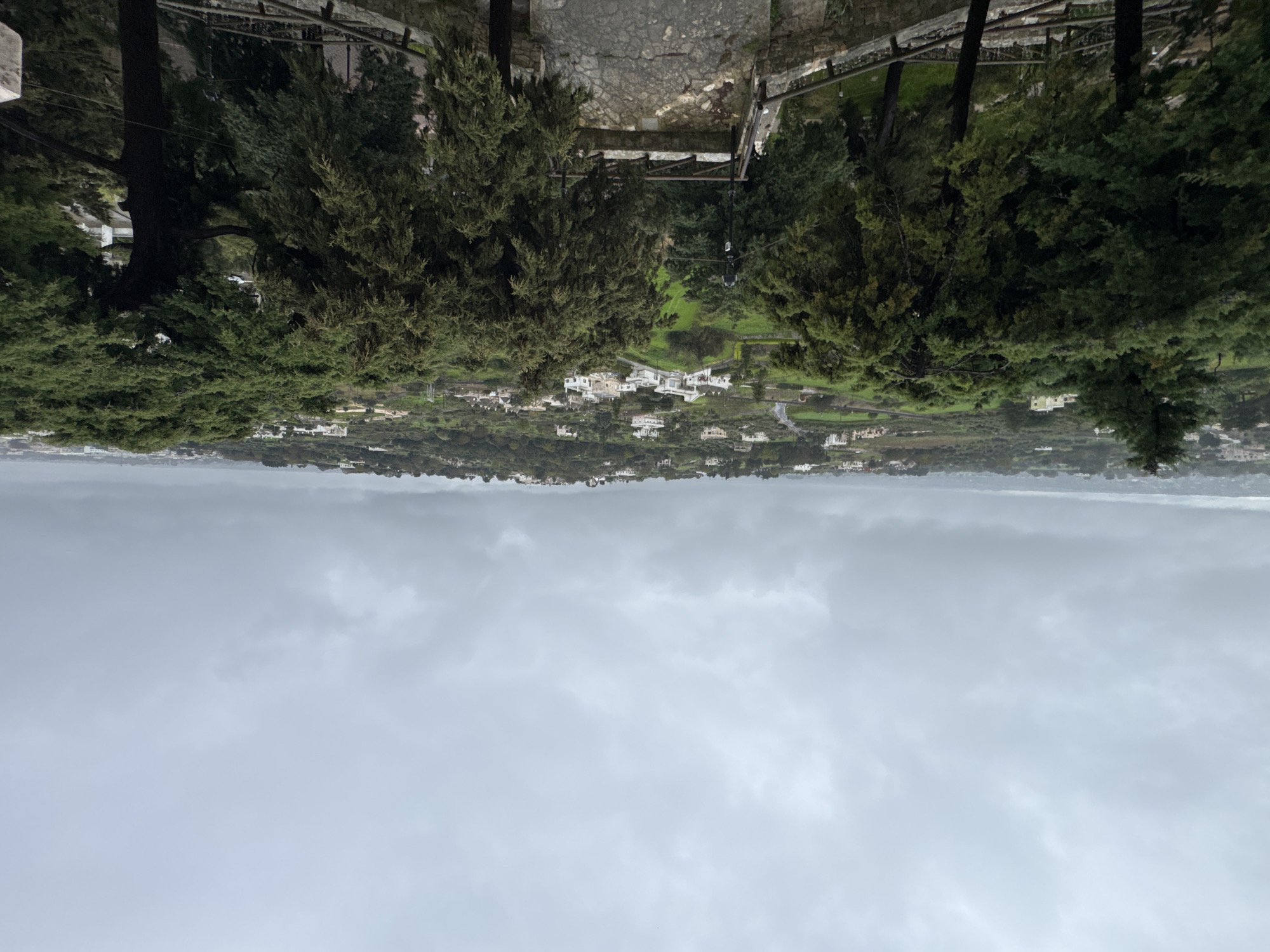 cityscape of Locorotondo, Italy, viewed from an elevated perspective. The lower part of the frame is dominated by an overcast sky. Above this, the town of Locorotondo is visible, characterized by closely packed white buildings and green foliage. The foreground contains trees lining what appears to be a stone pathway. A wooden railing runs along the side of the path. The scene has a muted color palette due to the overcast conditions.