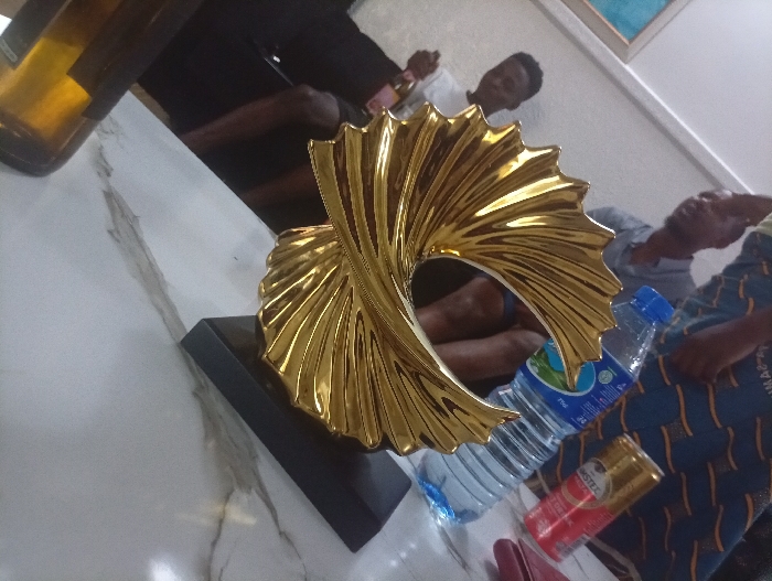 An indoor scene features a golden, corrugated, circular sculpture on a dark rectangular base, positioned centrally on a white table with grey veining. To the left of the sculpture, a brown glass bottle is partially visible. To its right, a plastic bottle of "Aqua" brand water with a blue cap and a red Amstel Malta can are present. In the background, three individuals are relaxing. One male in a white shirt and dark trousers smiles towards the camera while holding a dark bottle. Another male, wearing a light-colored shirt, looks upwards. A third individual, partially visible on the far right, wears a dark blue garment with a yellow pattern. The background consists of a light-colored wall with a framed picture displaying a blue abstract design in the upper right quadrant. The visual evidence within the image does not provide specific identifiers to pinpoint an exact location within the city of Jos, Nigeria; however, the products visible (Amstel Malta, "Aqua" brand water) are commonly found in Nigeria.