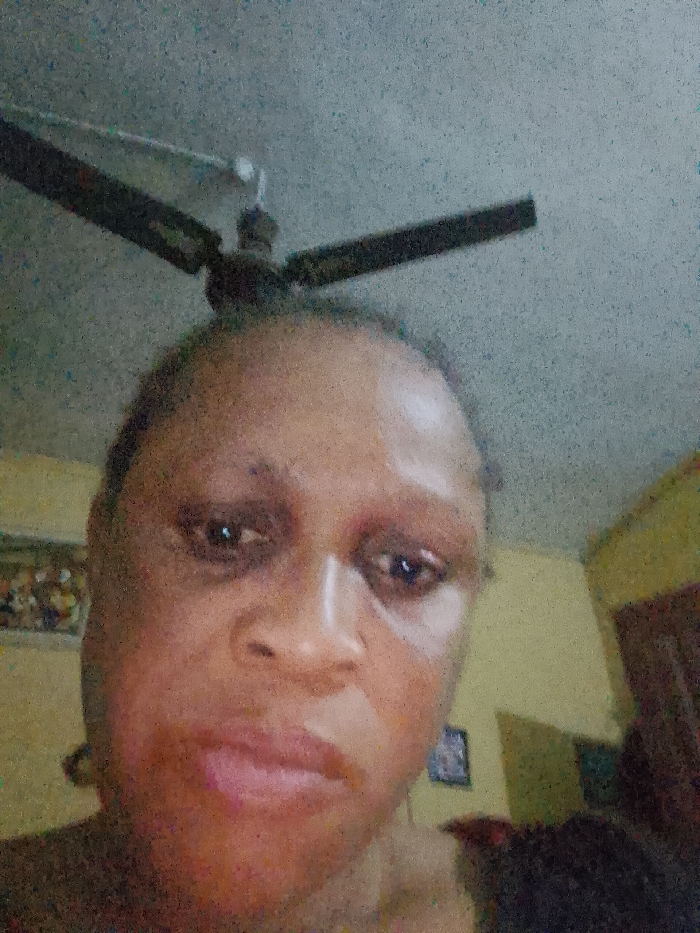 The image depicts an indoor scene in Agani, Nigeria. A dark-skinned individual, appearing to be an adult female, is positioned centrally, facing directly towards the camera in a close-up selfie. Her eyes are open and directed at the lens, and her expression is neutral. Her hair is styled back and appears to be gathered on top of her head. The upper portion of a dark-bladed ceiling fan is visible in the background, mounted to a light-colored, textured ceiling. To the left of the individual, a light-colored wall features a framed piece of artwork containing multiple colorful elements. To the right, another light-colored wall displays a smaller, dark-framed object. The overall lighting is subdued, contributing to a grainy image quality. No specific actions or interactions beyond the act of taking a photograph are discernible.