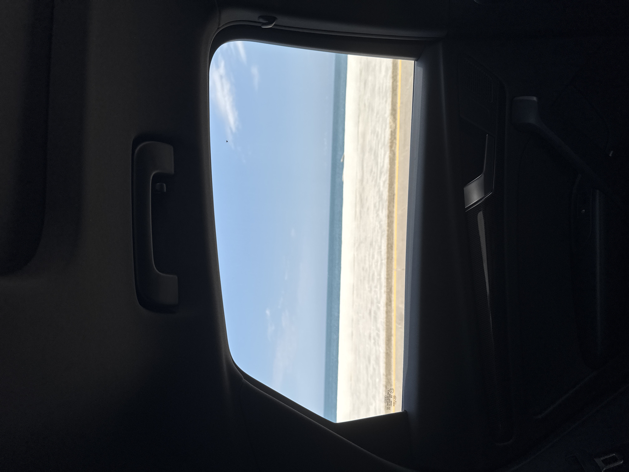 The view from inside a vehicle frames a scene of Boca del Río, Mexico. Outside the window, the sky is blue with scattered clouds, meeting the ocean along the horizon. A sandy beach stretches to the right, marked by a yellow line. The interior of the vehicle is dark, with the window surrounded by black upholstery and car fixtures like a grab handle and trim.