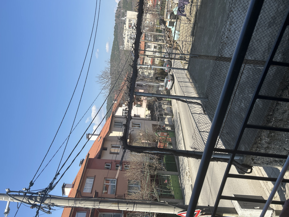 The image depicts a daytime street scene in Dupnitsa, Bulgaria, viewed from an elevated perspective, likely a balcony. The sky is clear blue with minimal wispy clouds. In the immediate foreground, a black metal balcony railing runs horizontally across the lower portion of the frame. Below the railing, a concrete wall is visible, featuring a grey electrical utility box affixed to its left side. A triangular warning sign, red-bordered with a white interior, is partially visible on the lower left. To the right of the concrete wall, a chain-link fence encloses a bare, concrete-surfaced lot where clothes are visible hanging on lines or fences. A utility pole stands on the far left, supporting multiple black electrical and communication wires that crisscross the upper midground. A gnarled, leafless vine structure, resembling an arbor, stretches horizontally across the midground, supported by several vertical poles. The midground features an asphalt street with a sidewalk visible on the left. Three vehicles are parked along the street on the right side, with a prominent silver sedan angled towards the curb. On the left side of the street, behind green metal fences and leafless deciduous trees, stand multi-story residential buildings. These buildings display orange tiled roofs and facades in beige and peach tones. Additional residential structures line the street further into the distance. The background reveals more urban buildings situated on a distant wooded hillside, under the clear blue sky. No individuals are discernible in the scene.