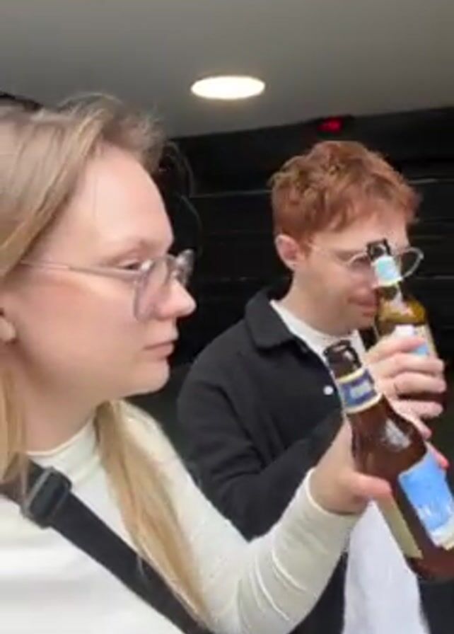 A woman and a man are standing outside a building, drinking from glass beer bottles. The woman is in the foreground, wearing a white sweater, a black crossbody bag, and glasses. She has long blonde hair. The man is slightly behind her and to the right. He has red hair and is wearing glasses and a black shirt. They both take a swig from their beer bottles. There is a number "110" on a sign above the building. The building has a black facade with glass doors. A person can be seen inside the building through the glass door. The video appears to be shot on a mobile phone.
