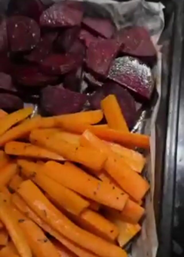 A hand peels back a sheet of aluminum foil to reveal a black metal baking sheet lined with parchment paper. Half of the baking sheet is filled with chopped beets and the other half with carrot sticks seasoned with herbs.