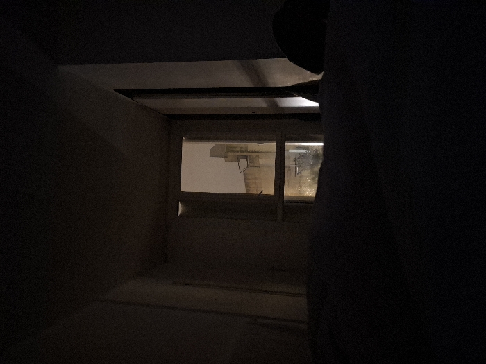 An dimly lit indoor space is visible through an opening in a dark foreground. A window occupies much of the far wall, with light shining through from outside. The interior walls are painted a light color, and the floor appears level. The foreground is heavily obscured, adding a sense of mystery and contrasting with the brighter view through the window.