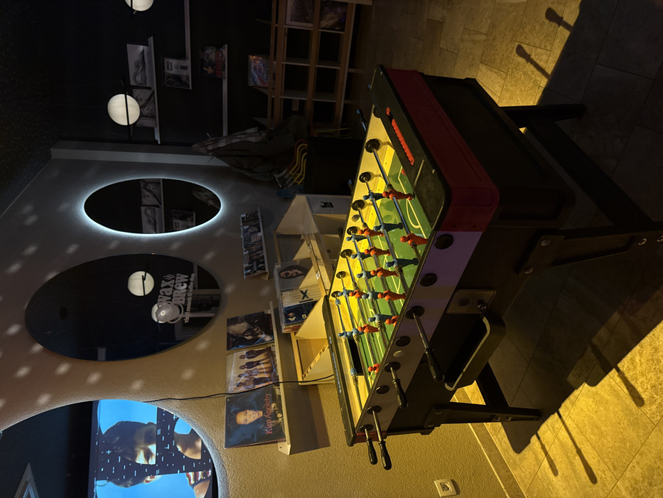 A foosball table dominates the scene, illuminated by warm light casting long shadows