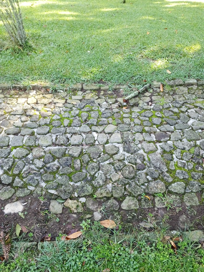 A stone path covered in moss and small plants connects a grassy lawn to a garden with low-lying greenery. The path's stones are irregularly shaped and gray. Gaps between the stones are filled with green moss and bits of white matter. The lawn above is well-manicured and green. Below, the garden area has a more wild and less maintained appearance with varying shades of green. A small branch lies across the path.