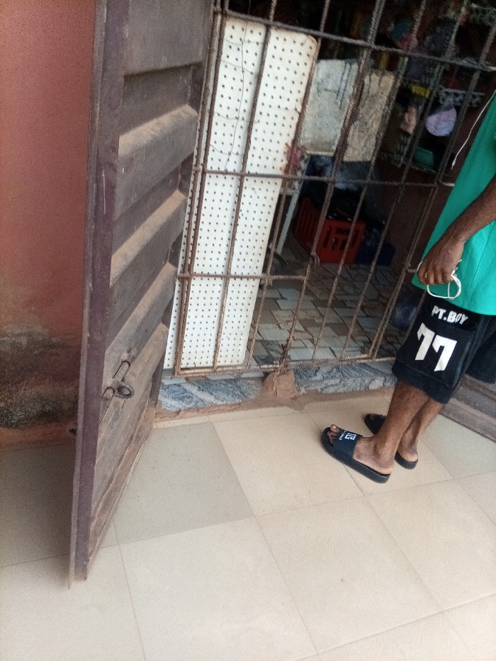 The scene depicts an entrance or threshold in Ukwu-Abwa, Nigeria. A dark brown, louvered wooden door, equipped with a metal latch, is partially open on the left, revealing a reddish-brown wall beyond. In the center, a rusted metal security grille secures an interior space. Behind the grille, a white perforated panel is visible, and the background reveals a patterned tiled floor, a red plastic crate, and indistinct objects. One individual, with dark skin, stands on the foreground's light beige tiled floor, wearing a light green t-shirt, black shorts with "PT.BOY 77" in white text, and black slide sandals (one displaying "ITALIA"). The individual holds white earbuds in their left hand.