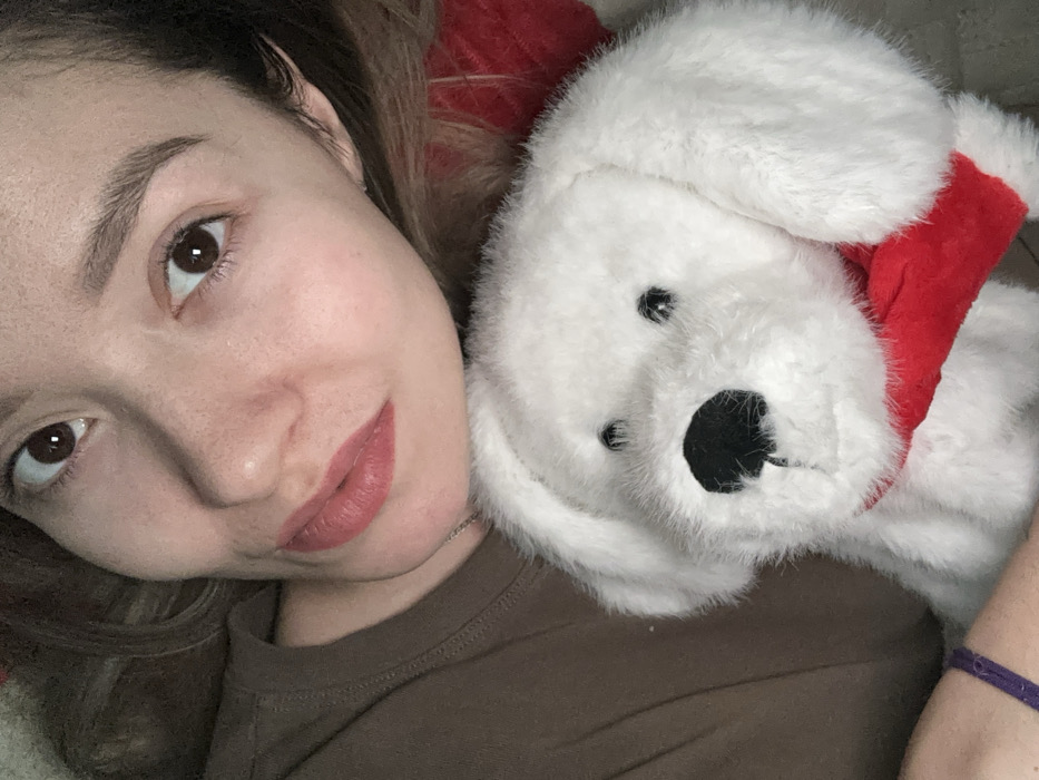 A woman lies next to a plush, white dog with a red collar. She has fair skin, brown eyes, and defined eyebrows. She is wearing a brown t-shirt. Her face is close to the camera, showing slight smile. The dog's face, with its black eyes and nose, is also prominently displayed. The background includes a glimpse of a reddish surface.