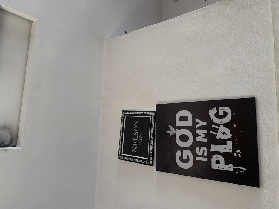 The image displays an indoor scene within a structure located in Ogbomosho, Nigeria. A white-painted wall occupies the lower and central portions of the frame, meeting a white ceiling that dominates the upper section. In the upper-right quadrant of the ceiling, a rectangular recess is visible, containing dark discoloration or soot marks. Two distinct pieces of wall art are mounted on the white wall. The upper item is a black rectangular frame with a prominent silver or white Greek key pattern border. Inside this frame, white text reads "NELSON" in a larger font, centered above "POUNDS" in a smaller font, all set against a black background. Positioned directly below and slightly to the left of the "NELSON POUNDS" frame is a larger, black rectangular canvas or print. This piece features stylized white text stating "GOD IS MY PLUG." A small white dove icon is situated above the word "GOD," and the letter "U" in "PLUG" is represented by a lightning bolt symbol. White splatter-like marks are visible near the bottom of the "P" and "L" in "PLUG." No individuals, active actions, or interpersonal interactions are depicted.