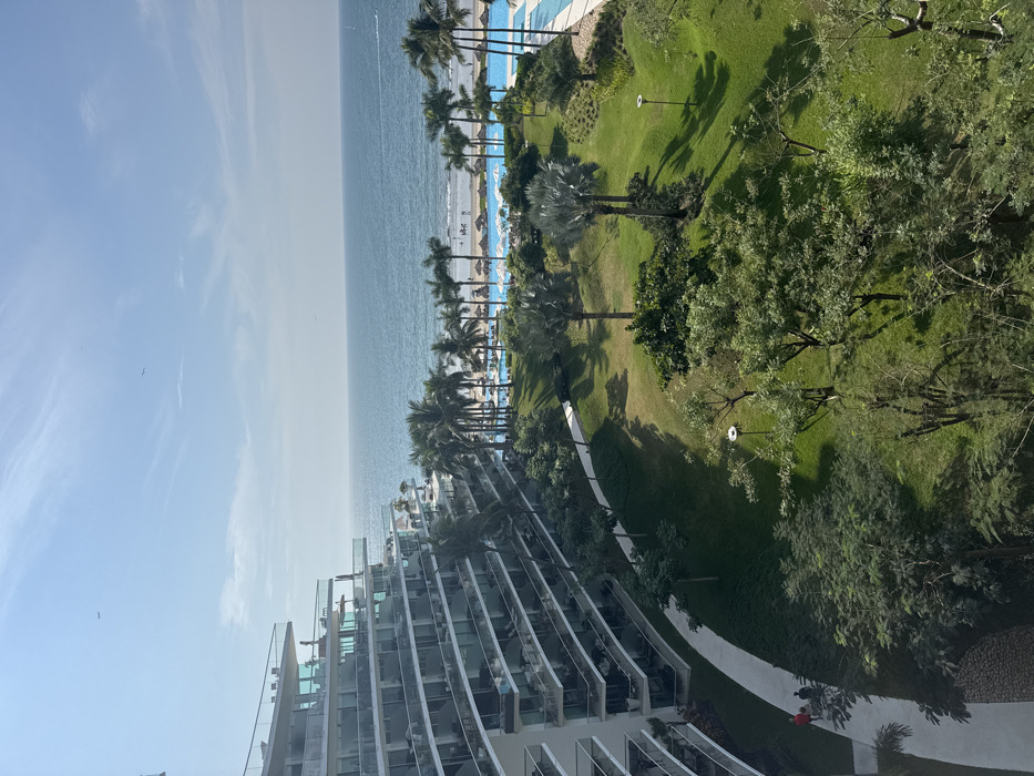 From a high vantage point, a coastal scene unfolds. A modern building with tiered balconies occupies the lower portion. Beyond, palm trees line the beach bordering the sea. A strip of sand is visible between the ocean and a turquoise pool. Lush green lawns and trees fill the upper-right quadrant. The sky is light blue with wispy clouds.