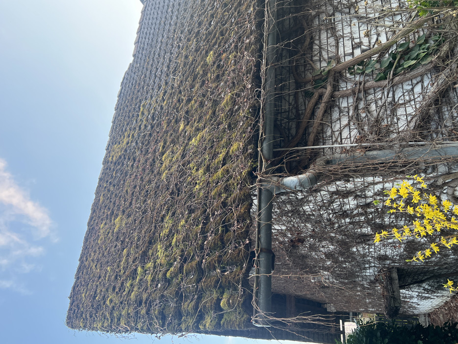 This image depicts a residential structure located within the city of Ljubljana, Slovenia. The scene captures the upper portion of a building, featuring a steeply sloped, tiled roof heavily covered in dark green moss and a dense network of bare, intertwining brown vines. A gray metallic gutter runs horizontally along the eaves, also partially draped with vines, connecting to a visible downspout on the right side. Below the gutter, a white brick wall is extensively concealed by thick, woody, leafless vines, with some green foliage emerging from a larger vine on the right side of the wall. In the lower-left foreground, a vibrant bush with numerous small yellow flowers is prominent. The sky overhead is clear blue with sparse white clouds, indicating a bright, daytime setting.