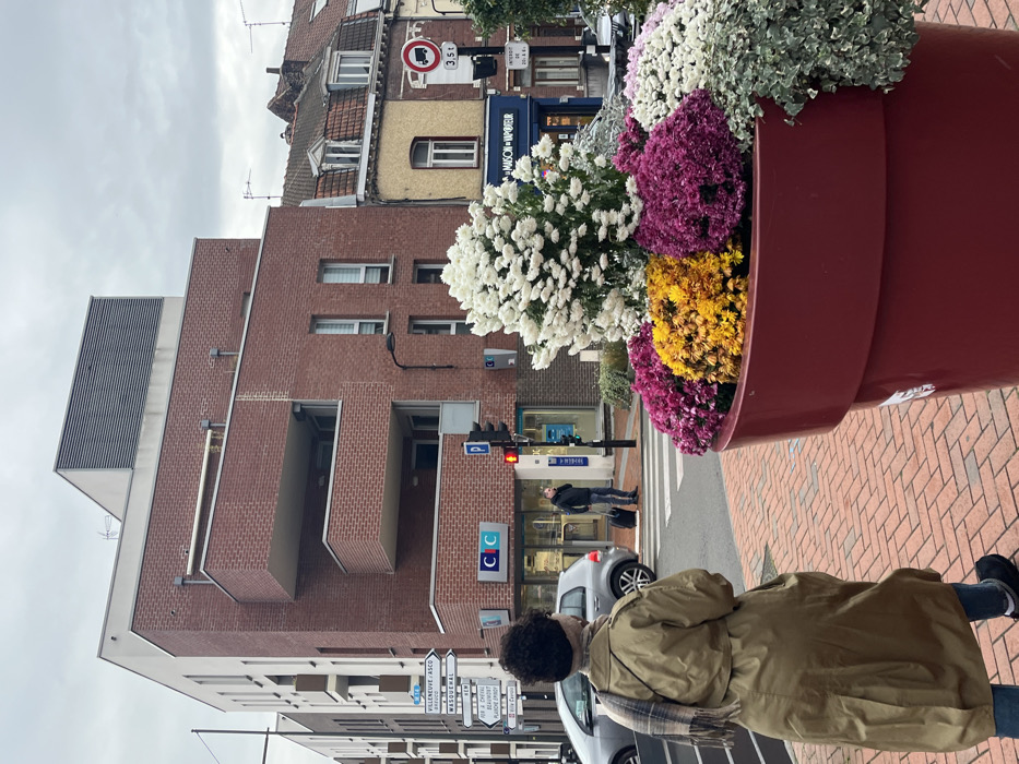 This image captures an urban street scene in Croix, France, under an overcast sky. In the foreground, a large, dark red, pot-shaped planter occupies the lower right, brimming with a variety of blooming chrysanthemums in white, yellow, and shades of pink/magenta, along with trailing green and white ivy. To the left, a person, viewed from behind, stands on a reddish-brown brick sidewalk. They wear a long, light olive-green trench coat, blue jeans, dark shoes, and a beige and brown plaid scarf draped around their neck. In the midground, a modern, multi-story building constructed primarily of reddish-brown brick with a lighter top section and flat roof dominates the center-left. This building features multiple windows and two projecting brick balconies. Its ground floor houses a "CIC" bank branch, identifiable by its blue signage and glass entrance. Adjacent to the bank, a traffic light displays a red signal. A man in dark clothing, holding a black wheeled suitcase, stands on the pedestrian crossing markings, seemingly awaiting to cross the street. A silver hatchback automobile is visible on the street to the left of the crossing. A street signpost with multiple white directional signs, pointing to various local destinations including "VILLENEUVE D'ASCQ" and "LILLE CENTRE," stands to the far left. To the right of the modern building, a row of older, traditional buildings with terracotta tiled roofs, dormer windows, and lighter-colored facades extends into the background. A storefront labeled "LA MAISON DU VAPEUR" is visible among these. A circular white traffic sign with a red border indicates a 3.5-ton weight restriction for trucks, with a subordinate sign indicating a time restriction of "INTERDIT DE 20 H A 6 H."