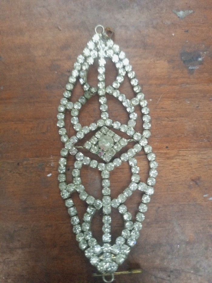 An ornate, silver-toned metal ornament, possibly a brooch or hair accessory, is depicted resting on a distressed wooden surface in Zee Pin Kone, Myanmar. The elongated, leaf-shaped piece is densely adorned with numerous clear, faceted rhinestones. Its design features a central rhombus containing a larger single stone, surrounded by an openwork pattern of interconnected loops and segments, all outlined with smaller stones. A small metal loop is visible at the top, and a gold-toned safety pin clasp is attached to the bottom. The wooden background displays varied brown tones, prominent grain, and surface imperfections. No people, actions, or interactions are present in the scene.