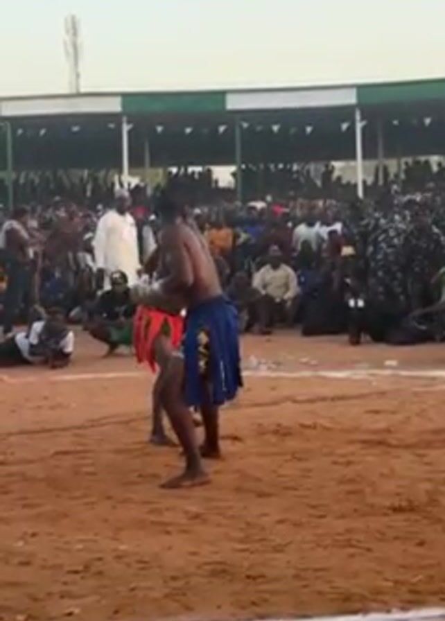 Two shirtless men in short skirts fight each other in a boxing match on a dirt ring. The skirts are different colors, one red and the other blue. They wear boxing gloves and are surrounded by a large crowd of people who are watching the match. The match takes place in an outdoor arena with a covered seating area.