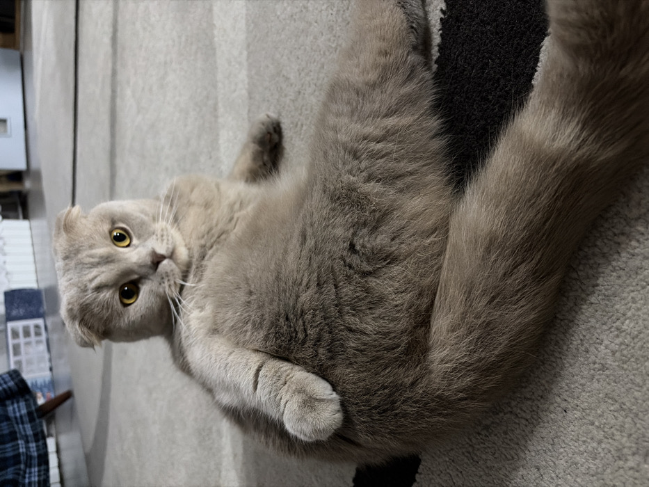 - "The image displays a light grey Scottish Fold cat with golden-yellow eyes and folded ears, lying on a light grey carpeted floor in an interior location within the city of Chaikovsky, Russia" by FM-rbhEP2, licensed under CC BY 4.0