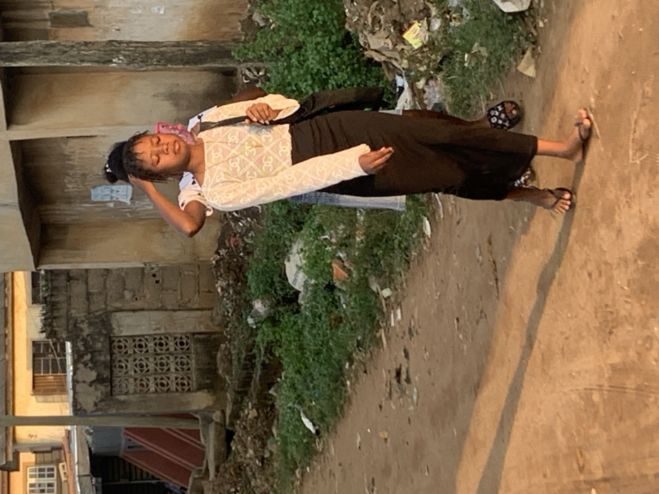 A young woman stands near a dirt path in an urban setting