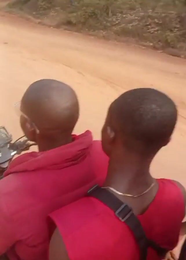 three people riding on a motorcycle along a dirt road. The person in the middle turns around to face the camera several times. All three are wearing red. The driver wears a red jacket, the middle person wears a red tank top, and the person in the back wears a sleeveless red shirt. The middle person has a gold chain around their neck and a black strap across their chest. The road is reddish-brown and lined with sparse vegetation and buildings in the distance. The sky is overcast.