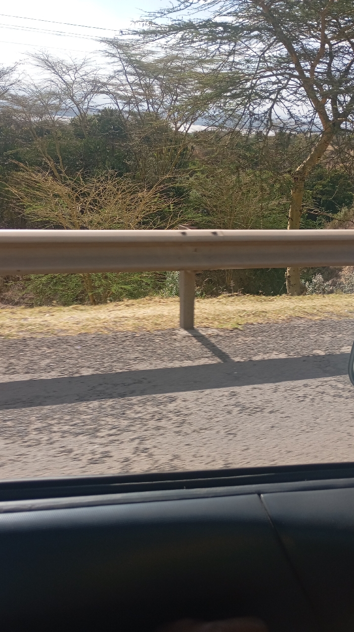 A view from inside a car shows a roadside scene