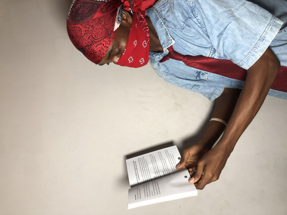 In Ngleshi Amanfro, Ghana, a single individual is depicted in a waist-up, off-center medium shot against a plain, light beige wall. The subject is male, with dark skin, wearing a red bandana with black and white patterns tied around his head, and a matching red bandana covering the lower half of his face, including the nose and mouth. He is dressed in a light blue short-sleeved denim shirt, unbuttoned at the collar, with a loosely knotted red tie hanging down. A light-colored band is visible on his right wrist. Both hands hold open a small, white-paged book. The subject's gaze is directed downwards towards the book, indicating reading. The book displays legible text fragments such as "OHA-ABES" and "OMANEM-FOTRA NANO PROTETIN" on the left and right pages respectively, with a visible page number '16' at the bottom. The lighting is even, casting a faint shadow to the left of the subject and the book.