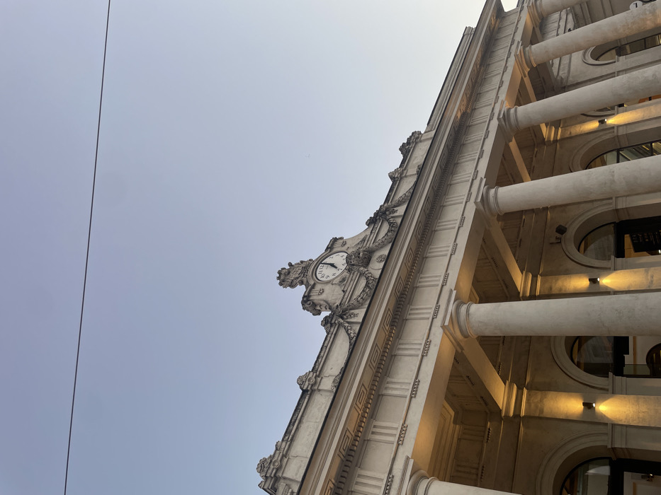 The image depicts the neoclassical façade of the Gare de Montpellier Saint-Roch train station in Montpellier, France. The central portion of the structure features a large, ornate clock tower with a white face displaying the time as approximately 11:55. This clock is set within a decorative pediment adorned with reliefs, including a central lion's head and draped swags. Above the clock, the roofline presents additional decorative cresting. The lower section of the building is characterized by a prominent colonnade of robust, round, light-colored columns supporting an entablature. Beneath the colonnade, multiple arched recesses are visible, some of which are illuminated by pairs of upward and downward-facing wall-mounted lights emitting a warm yellow glow. These arches likely frame windows or doorways. The overall structure appears to be constructed of light-colored stone or concrete. The sky above is clear and light blue, traversed by a single, thin dark wire stretching horizontally across the upper frame. No individuals or specific activities are discernible.