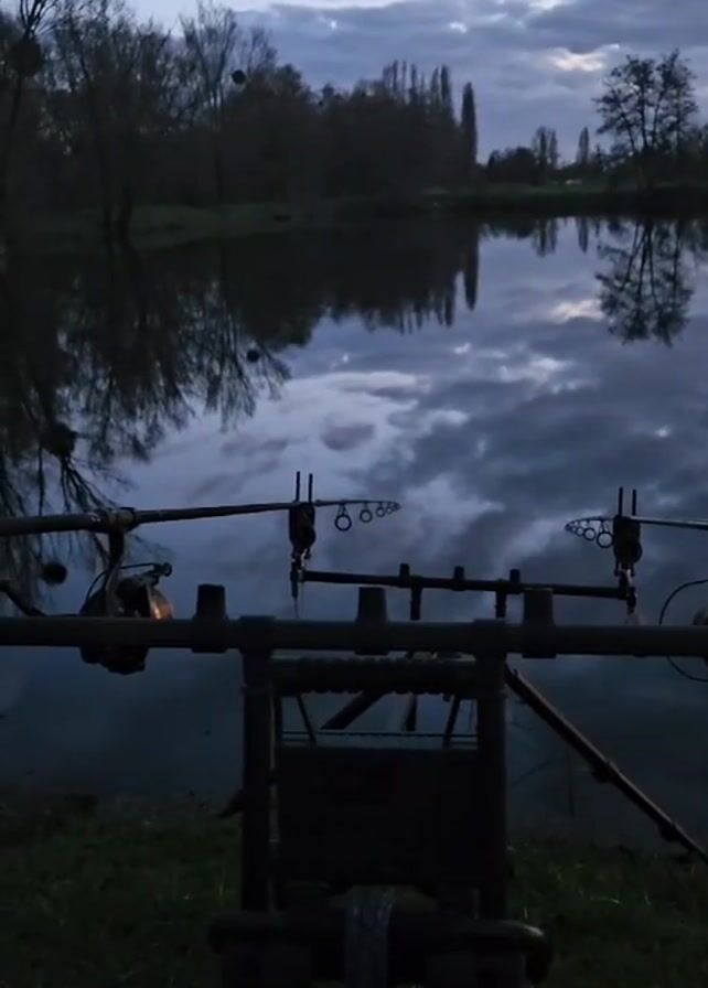 nighttime scene of a fishing setup in front of a calm lake. Two fishing rods are mounted on a rod stand, silhouetted against the water. The water reflects the cloudy sky, which is a dark blue, indicating it may be dusk or dawn. Trees and other vegetation line the edge of the lake. The scene is still and quiet.