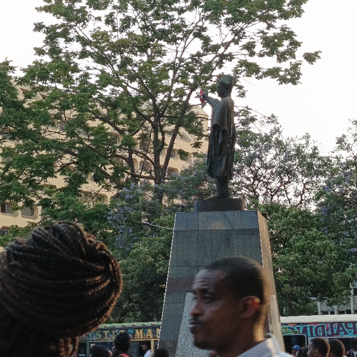 The image displays the "Freedom Fighter's Statue," depicting a draped bronze figure holding a small, indistinct object (possibly a wreath or bouquet) aloft in its raised right hand. The statue stands upon a multi-tiered, dark granite pedestal. This monument is located at Freedom Corner within Uhuru Park, Nairobi, Kenya. The background is dominated by dense green tree foliage, with some trees exhibiting purple blossoms, partially obscuring a multi-story, light-colored building featuring arched windows. The sky is bright and diffuse, visible through the tree canopy. In the blurred foreground, the back of a person's head with dark braided hair is visible on the left. To the right, the right profile of a man with a mustache is visible. A blurred gathering of people and indistinct commercial signage, including text fragments such as "MYSTIC MAN" and "TOHAYA," are present at the base of the statue's pedestal in the midground.