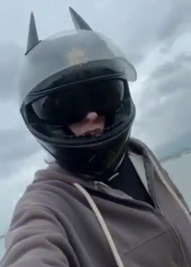 person wearing a black motorcycle helmet with a clear visor, standing outdoors. The helmet has decorative, bat-like ears attached. The person is wearing a gray hooded sweatshirt and faces the camera. Behind the person, there is a large body of water, possibly a lake or bay, with sparse vegetation along the shoreline. In the distance, a mountain range is visible under an overcast sky. The camera slowly pans to show more of the landscape.