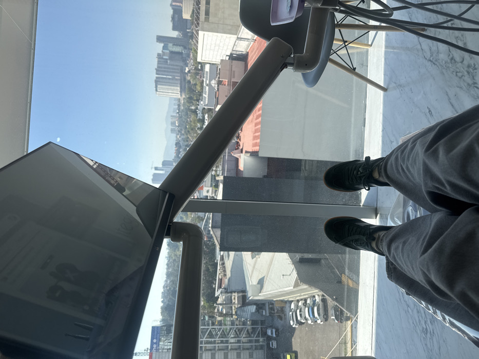 The image presents a first-person view from an interior space, identified as a medical or dental examination room, situated high in a building within Interlomas, Mexico. The subject's legs and feet are extended horizontally into the foreground, clad in grey trousers and dark sneakers with light soles. The floor is light-colored, featuring a subtle grey pattern, indicative of marble or polished tile. In the midground, components of professional equipment are visible: an articulated grey arm with a reflective display surface partially obstructs the upper left portion of the view. Another articulated grey arm extends from the right, positioned near a light grey chair with wooden legs. This arm supports multiple grey medical tubes, terminating at a small light purple tray containing several small white objects. Through a large window, a panoramic view of the Interlomas cityscape unfolds under a clear blue sky. Directly below and to the left of the building, a parking lot contains several light-colored vehicles. Various building rooftops, featuring both grey and reddish-orange surfaces, are visible in the immediate vicinity of the structure. The mid-distance and horizon reveal numerous modern high-rise buildings, interspersed with clusters of green vegetation and distant hills. A partial blue sign, reading "Medline" or similar, is visible on a building to the far left of the exterior view.