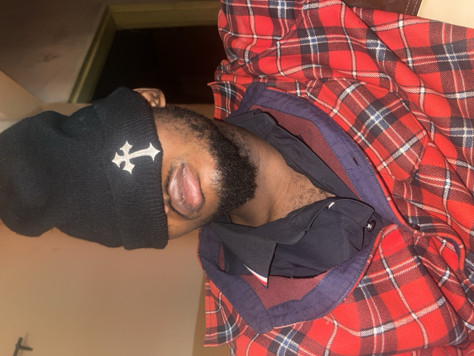 A single individual, presumed adult male, is depicted in a close-up portrait. The person's eyes and forehead are obscured by a black knit beanie, which features a prominent silver or white flory-style cross emblem centered on the front. A short, dark beard and mustache are visible, along with full lips. The individual wears a red, black, white, and blue plaid long-sleeved shirt, unbuttoned, revealing a dark (likely black or navy) collared shirt underneath, which is also partially unbuttoned, exposing some chest hair. The plaid shirt has a navy collar with a reddish-brown underside trim. The background is indistinct, indicating an indoor setting with light-colored walls on the left and a darker area, possibly a doorway or corner, on the right. Lighting appears to be internal. The specific location in Muchiya, Nigeria, cannot be confirmed by visual evidence within the image.