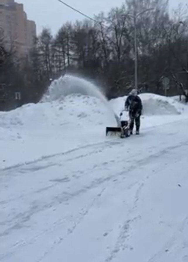 In a medium shot, a person is using a snowblower on a snow-covered road
