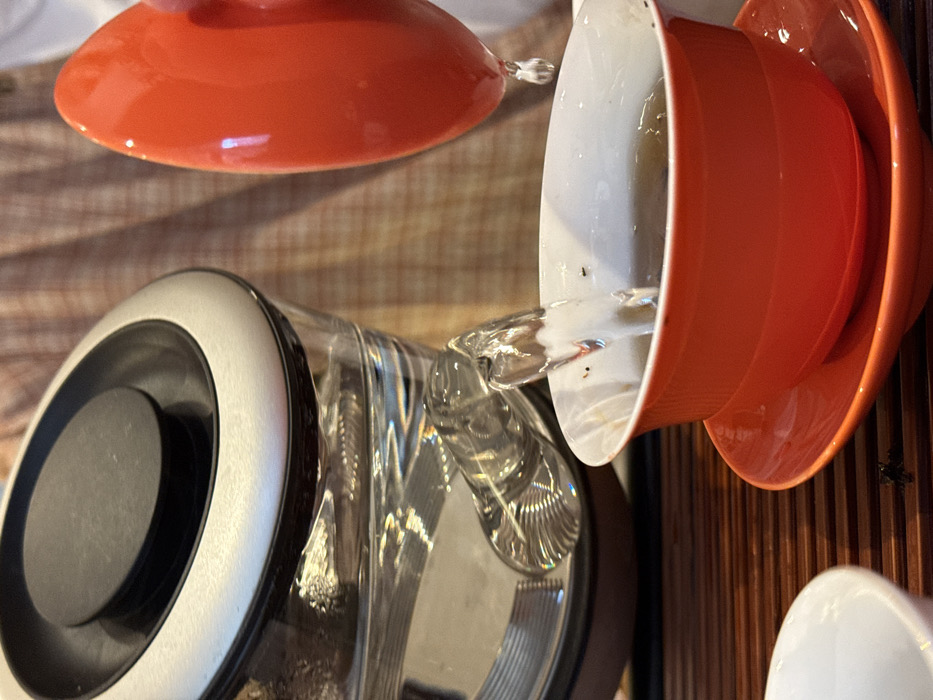 In Budva, Montenegro, a close-up forensic view captures a tea preparation scene. A stream of clear liquid, likely hot water, descends from the spout of a transparent glass electric kettle with a silver and black lid, into an orange teacup with a white interior. The teacup rests on a matching orange saucer, and dark tea leaves are visible within the liquid already present in the cup. To the lower left, a portion of a smaller white cup or bowl is visible. To the upper right, a vertical, highly reflective, solid red object, possibly a tea lid or small bowl, shows a single droplet of liquid detaching from its lowest point. The items are positioned on a dark brown, horizontally slatted wooden surface, consistent with a tea tray or mat. The background is a soft, blurred light brown and beige plaid textile. No individuals are visible, though their implied presence is indicated by the actions.