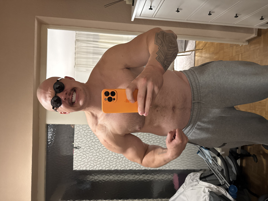 An adult male stands indoors, captured in a mirror selfie taken with an orange-cased smartphone held in his right hand. He is bald, has a prominent mustache, and wears dark, round-framed sunglasses. His expression is a grimace, showing clenched teeth. He is shirtless, displaying a muscular physique, with his left arm flexed at the bicep. A tattoo with geometric patterns is visible on his left forearm. He wears gray sweatpants with the "Puma" logo on the upper left thigh. The background on the left features a partial view of a baby stroller or pram with blue components. On the right, a white dresser with five drawers and dark circular knobs is visible. Beyond the dresser, an open doorway reveals a room with light-colored curtains and a patterned rug on the floor. A small, dark object rests on top of the dresser. The environment appears to be an interior residential space. The specific location within the city of Metz, France, is not discernible from the visual information provided in the image.