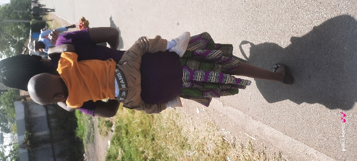 The scene depicts a daytime outdoor environment on a paved thoroughfare in Homa Bay, Kenya. A person, viewed from behind, walks away from the camera, carrying a young child on their back. The adult wears a dark purple top, a patterned skirt with green, purple, white, and black geometric designs, and dark flat sandals. The child, facing away, wears an orange short-sleeved t-shirt, brown cargo-style pants with a visible white waistband featuring "JEANS" text and arrow graphics, white socks, and white sneakers. The child's arms are wrapped around the adult's neck. To the left of the paved path, a strip of dry grass precedes a low, dark wall and further green vegetation. A metallic corrugated fence is visible beyond. In the middle ground on the right side of the path, a man in a light blue shirt and a light-colored hat walks towards the camera, holding a cluster of reddish-brown spherical objects in his right hand. Additional individuals and trees are visible further down the path. Strong sunlight casts long, distinct shadows on the paved surface.