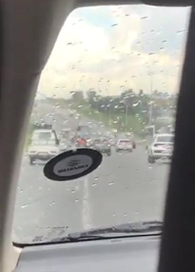 The video is shot from inside a car looking out of the front windshield. The windshield is covered in raindrops. Traffic is visible ahead on a multi-lane road. The sky is overcast. There is a black oval sticker with the word "SUZUKI" on the windshield. The car is moving forward.
