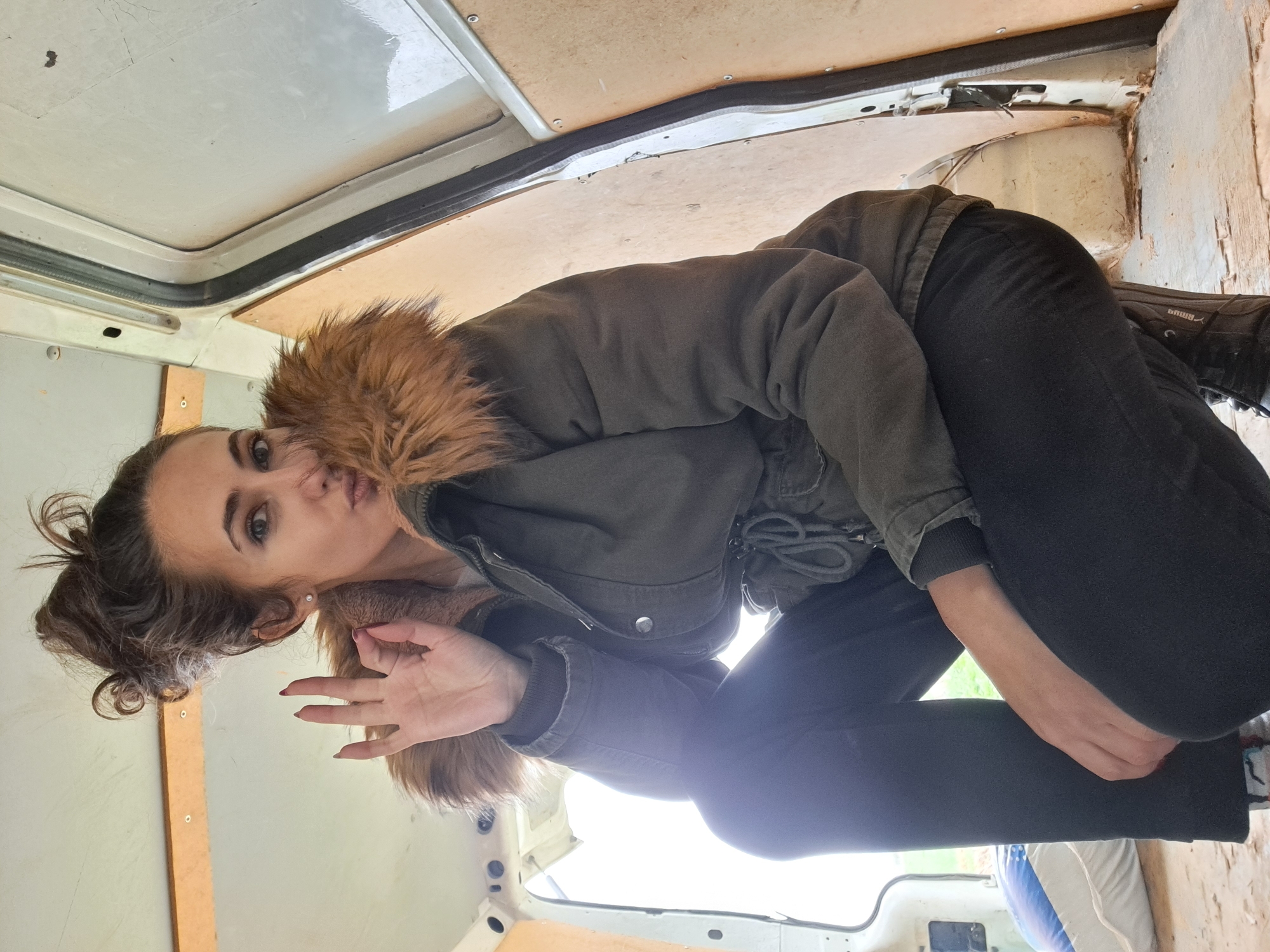 - "A woman with brown hair, wearing a dark green jacket with a fur collar, black pants, and black boots, is crouched down inside the back of a white van" by FM-9hQ1C3, licensed under CC BY 4.0