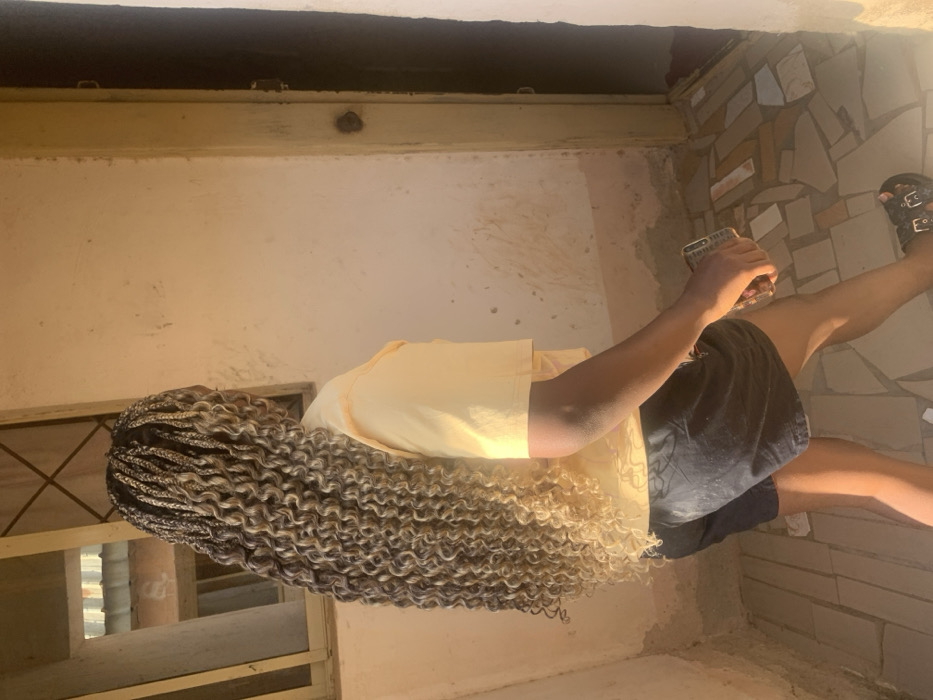 A woman with long, braided hair, transitioning from dark to blonde, poses in a room with partially finished walls. She wears a light yellow top and dark shorts, holding a phone. Her legs are bare, adorned with dark sandals. The room features mosaic tiles on one wall and a window. Sunlight illuminates the scene.