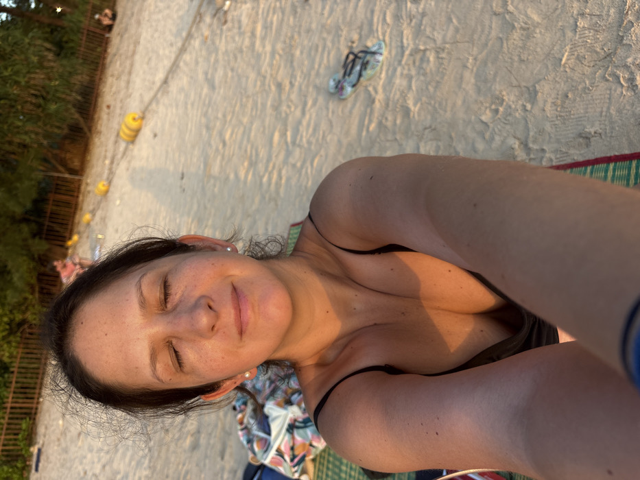 The image depicts a selfie of a female subject on a sandy beach in Ban Ao Nang, Thailand, illuminated by warm, low-angle sunlight indicative of golden hour. The woman, with dark hair and visible freckles, has her eyes closed and a slight smile on her face. She wears a black spaghetti-strap top and small pearl stud earrings. Her forearms are extended towards the camera, occupying the lower portion of the frame. She is seated on a mat with green and red stripes. To her immediate left, a multi-colored, patterned blanket or towel is partially visible. To her right, a pair of light-colored, patterned flip-flops are on the sand. In the midground, a rope strung with multiple yellow buoys runs horizontally across the sand, casting shadows. Two additional, indistinct individuals are visible further in the background, seated on the sand: one to the left of the buoy line wearing a light-colored top, and another further right. A treeline and a wooden fence form the distant background of the beach.