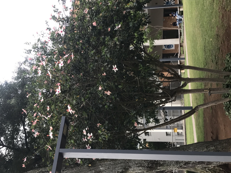 The image displays an outdoor daytime scene, characteristic of a landscaped urban or suburban environment in Midrand, South Africa. A prominent, multi-stemmed bush, densely populated with dark green leaves and numerous pink and white flowers, each exhibiting a reddish-pink center, occupies the central and right-midground. To the left, a vertical, light grey rectangular pole is positioned near the textured trunk of a larger, older tree. The ground consists of dark soil and low green groundcover around the base of the flowering bush, transitioning into a manicured green lawn that extends through the midground. In the background, a light-colored, multi-story building with multiple rectangular windows and balconies featuring grey railings is partially visible on the left. A yellow warning sign with dark text is discernible near its base. To the right, a modern building structure with a covered outdoor walkway or patio area features a white circular emblem with blue patterns on a supporting column and blue and white geometric artwork on an adjacent wall. Two individuals are seated on a light-colored, elongated bench within this covered area; one wears dark clothing and jeans, while the other is dressed in a blue hoodie and jeans. The sky above is overcast, providing uniform, diffused light.