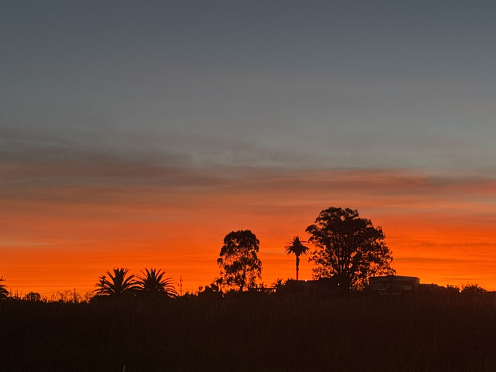 An orange and red sunset fills the sky above a dark, silhouetted landscape. The horizon line features palm trees, bushes, and other trees. A soft gradient transitions from orange to grey in the upper portion of the sky. The orange glow creates a stark contrast with the dark foreground. A few structures, including what appears to be an RV, are vaguely visible on the horizon.