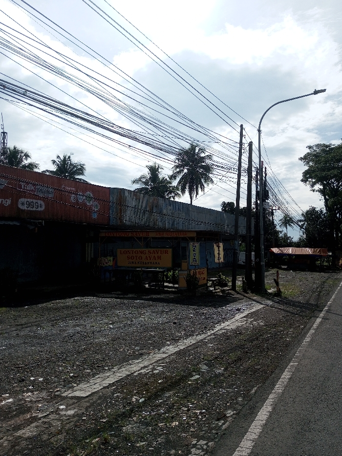 The image depicts an outdoor, low-angle scene under a partly cloudy sky, characteristic of a tropical or subtropical environment. The foreground features a gravel and dirt ground with patches of sparse vegetation and a white line marking the edge of a paved asphalt road on the right. Numerous utility poles with a dense entanglement of overhead wires dominate the mid-ground and extend across the upper frame. One pole on the far right supports a curved streetlamp arm and fixture. On the left, a series of rustic, low-rise structures or stalls are constructed from corrugated metal sheets, some painted orange-red and others weathered grey. Visible signage on these structures includes a prominent yellow sign displaying "LONTONG SAYUR SOTO AYAM" and "JIWA NUSANTARA." Above it, an orange-red sign shows partially obscured text, including "Telkomsel" and "*999#." Behind these structures and poles, multiple tall coconut palm trees are visible, along with denser foliage from other green trees on the far right. Further to the right in the mid-ground, a smaller, temporary structure with an orange tarp roof is discernible. No people are present or engaged in any actions or interactions within the frame. The presence of "Lontong Sayur," "Soto Ayam," "Jiwa Nusantara," and the "Telkomsel" brand strongly indicates the location is in Indonesia, not Domphoog_Dungkarchhoeling, Bhutan.