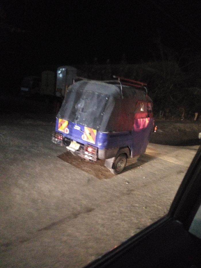 A dark, slightly blurred image shows a blue auto rickshaw with a dark canopy parked on a dimly lit road at night