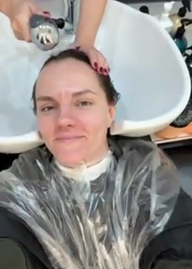 A woman with fair skin is at a hair salon, having her hair washed over a white basin