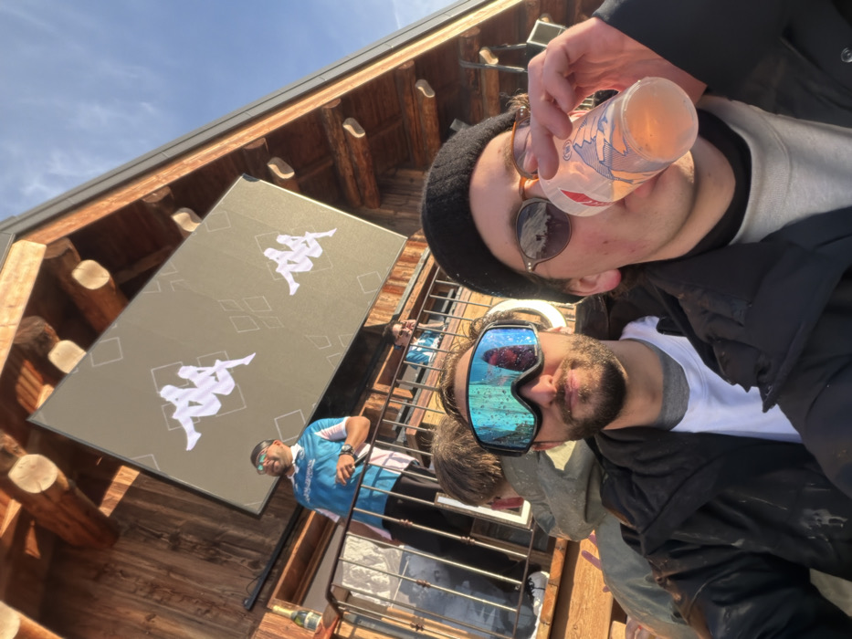 Three men are visible outside a wooden building. One man wears a black beanie and sunglasses while drinking from a cup with mountain motifs. Another man wears ski goggles and a white t-shirt under a black jacket. The third man, in a blue athletic shirt, stands near a Kappa-branded surface with a design featuring a couple embracing. The building's wooden structure is prominent, set against a blue sky with sparse clouds.