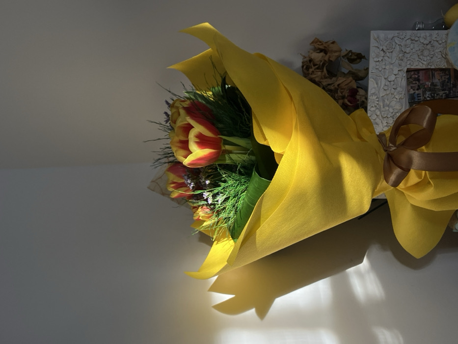 The scene is set indoors, within the city of Plovdiv, Bulgaria. A vibrant bouquet occupies the central foreground, featuring several bicolored tulips with prominent red petals edged in yellow, arranged amongst diverse green foliage including narrow, needle-like sprigs and broader leaves. Small clusters of delicate purple flowers are interspersed throughout the arrangement. The bouquet is wrapped in bright yellow, textured non-woven fabric, gathered and tied near its base with a brown satin ribbon forming a bow. The immediate environment consists of plain, light-colored walls, meeting at an interior corner behind the bouquet. Direct sunlight illuminates the left side of the scene, casting sharp shadows of the bouquet and an indistinct object onto the left wall. To the right of the bouquet, resting on an unseen surface, a portion of a white, intricately carved or embossed decorative frame is visible. A small, dark rectangular object, possibly a photograph or card, is partially discernible within the frame. Further to the right and slightly behind, a quantity of dried, brown plant material is present. No individuals, specific actions, or interactions are observed in the image.