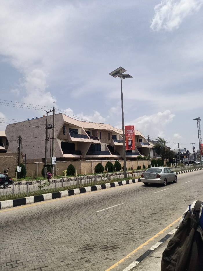 The scene depicts an urban street in Ilado, Nigeria, under a partially cloudy daytime sky. A two-lane road paved with interlocking concrete blocks occupies the foreground, marked by a white dashed line and a solid yellow line on the right shoulder. A silver sedan, possibly a Toyota Corolla, travels right-to-left in the lane closest to the viewer. A concrete median with black and white striped curbs separates the roadway from a pedestrian zone. On the left side, beyond the median, a row of light-colored, multi-story buildings with distinctive angular architecture and dark-framed balconies is visible. These structures are set behind a low wall and a strip of manicured green shrubs. Utility poles with overhead power lines and multiple satellite dishes on rooftops are present near these buildings. One individual, dressed in a purple top and dark trousers, walks on the paved sidewalk in the pedestrian zone, moving from left to right. A dark vehicle is partially visible parked on the far left near the sidewalk. Tall, grey streetlights equipped with dual solar panels are positioned along the median. A red banner, displaying "ZERO CHARGES," is affixed to the streetlight in the mid-ground. Another similar streetlight is visible further down the road. In the distance, the road continues, flanked by additional buildings and utility infrastructure.