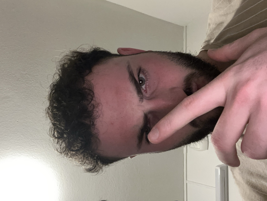 A man with dark, curly hair, a beard, and fair skin poses closely to the camera